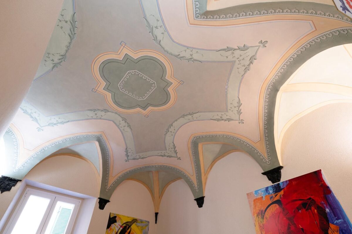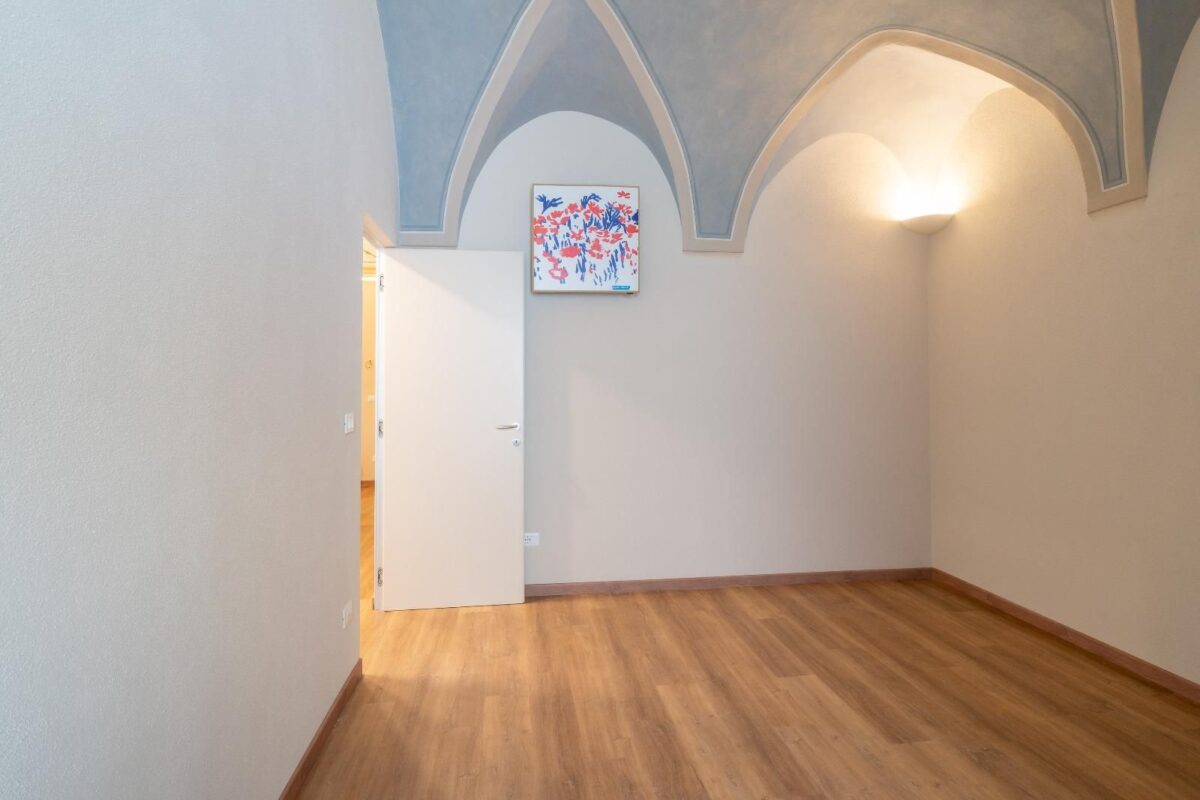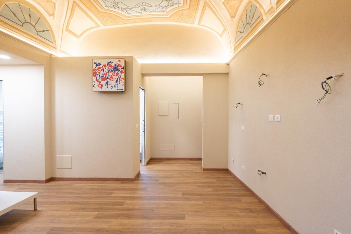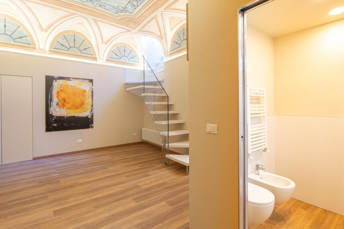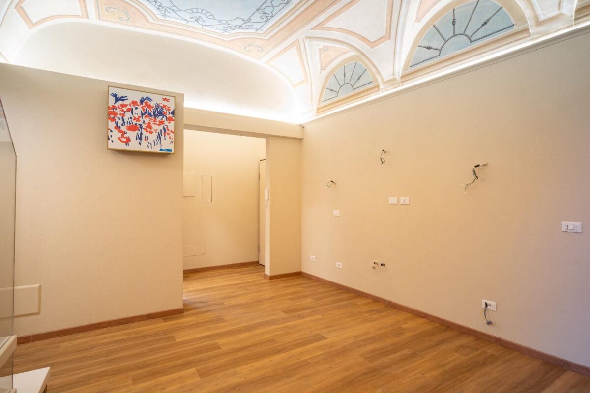 Un ampio soggiorno con soffitti affrescati, due comode camere da letto, doppi servizi completi.