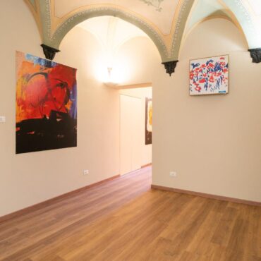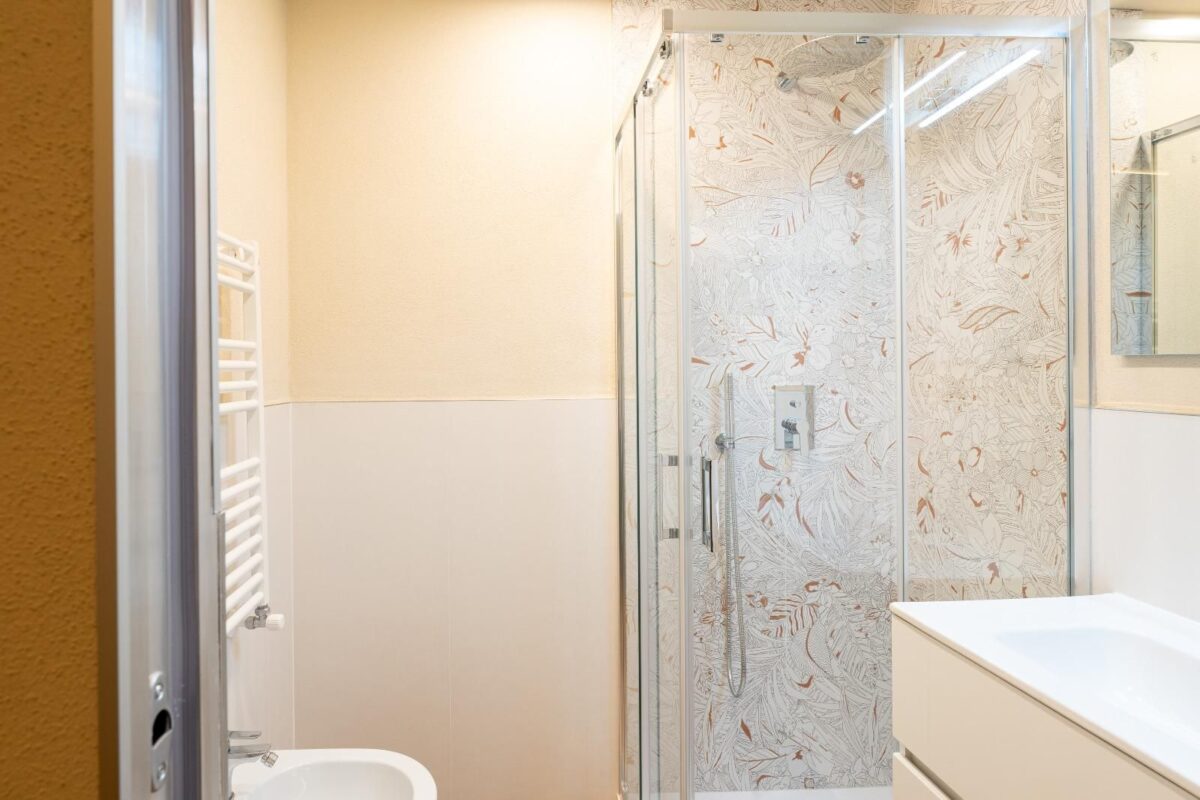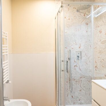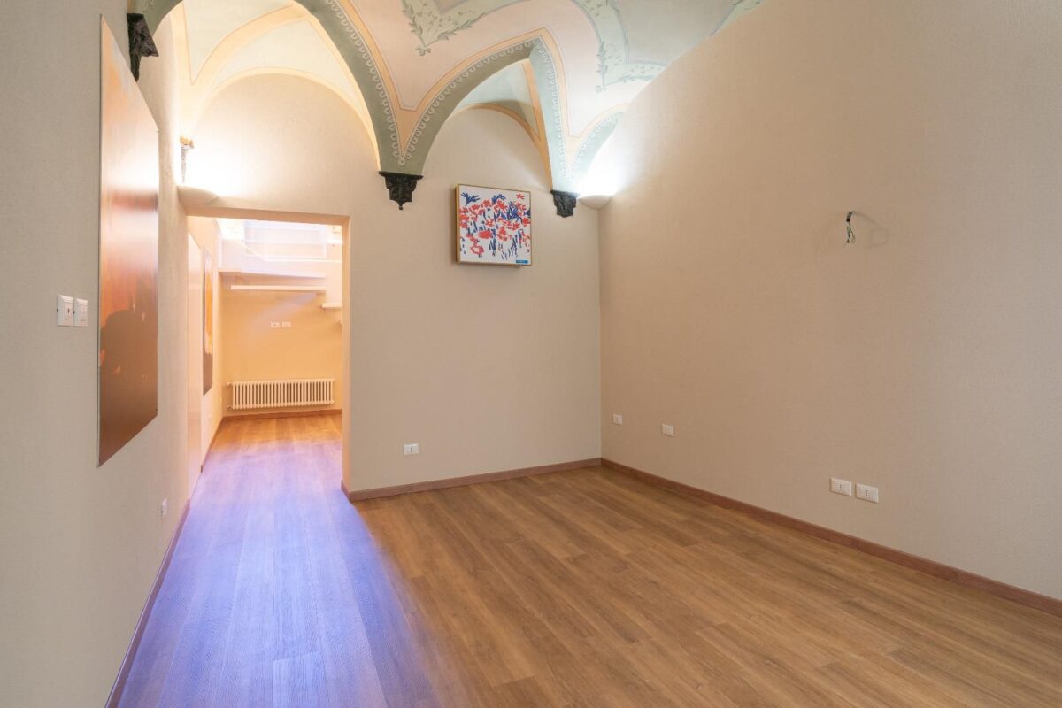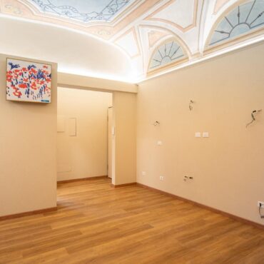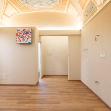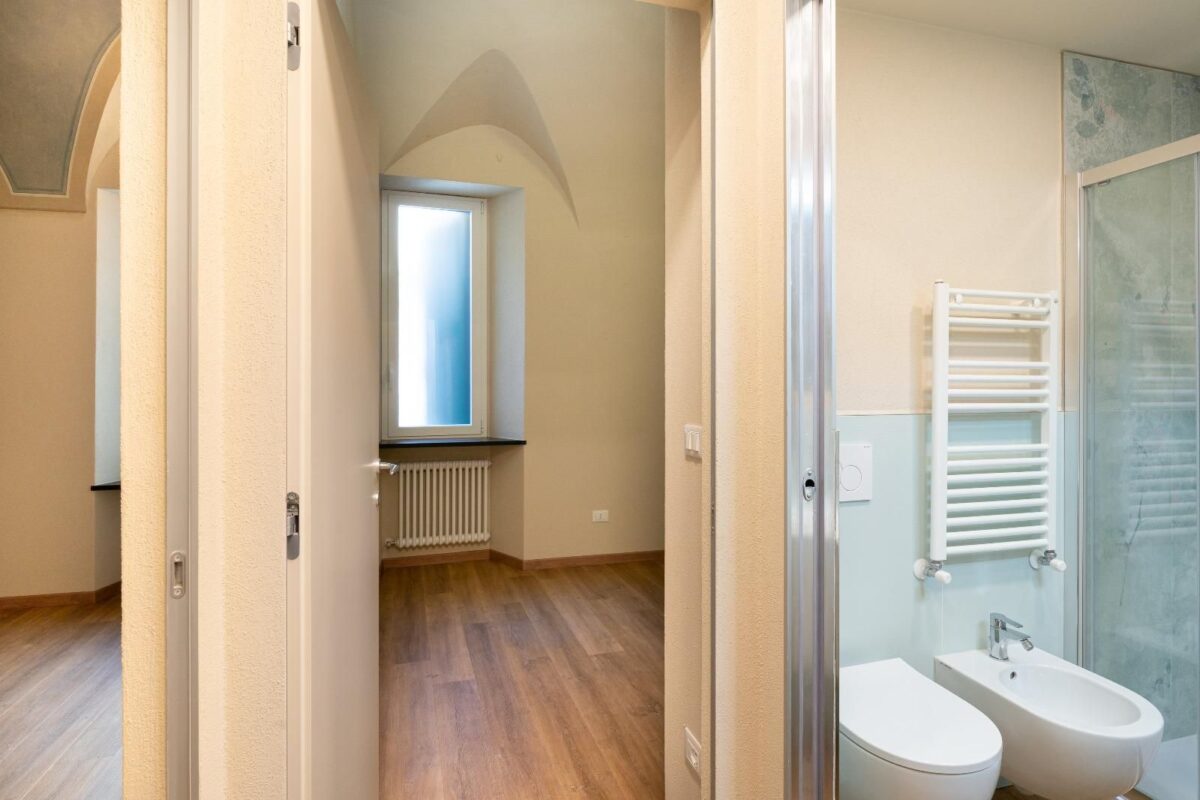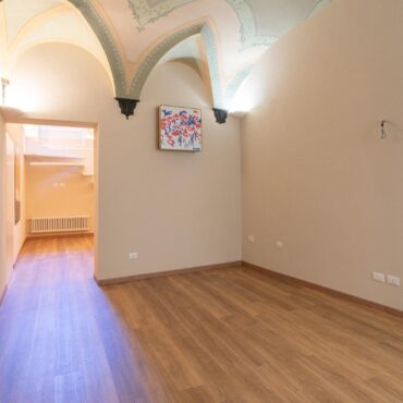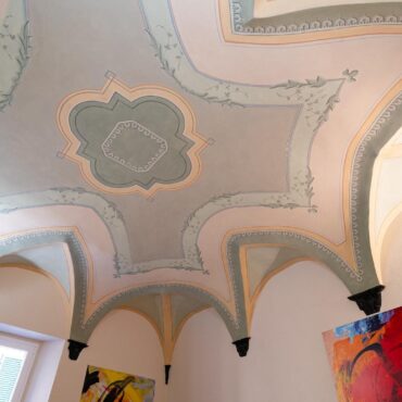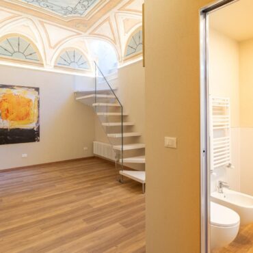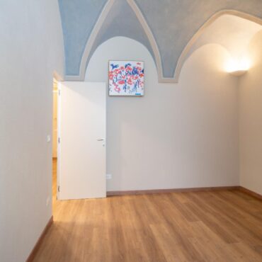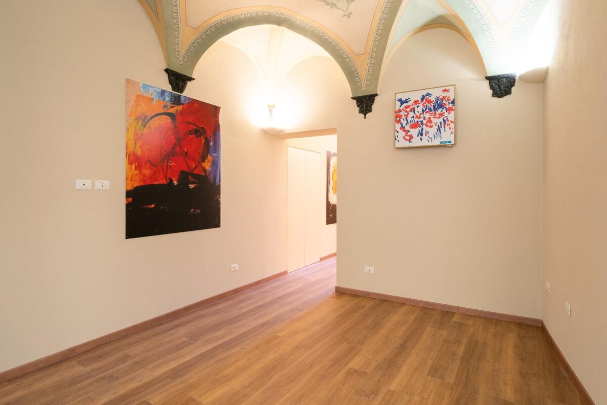 Un ampio soggiorno con soffitti affrescati, due comode camere da letto, doppi servizi completi.