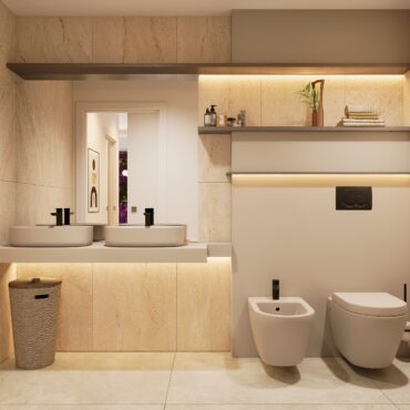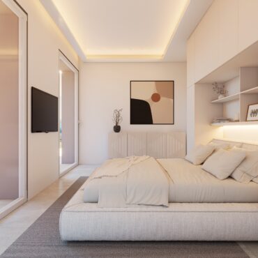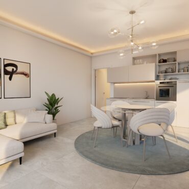 La superficie interna propone un ampio living con angolo cottura, due camere da letto matrimoniali, di cui una con cabina armadio) e due bagni completi con doccia.