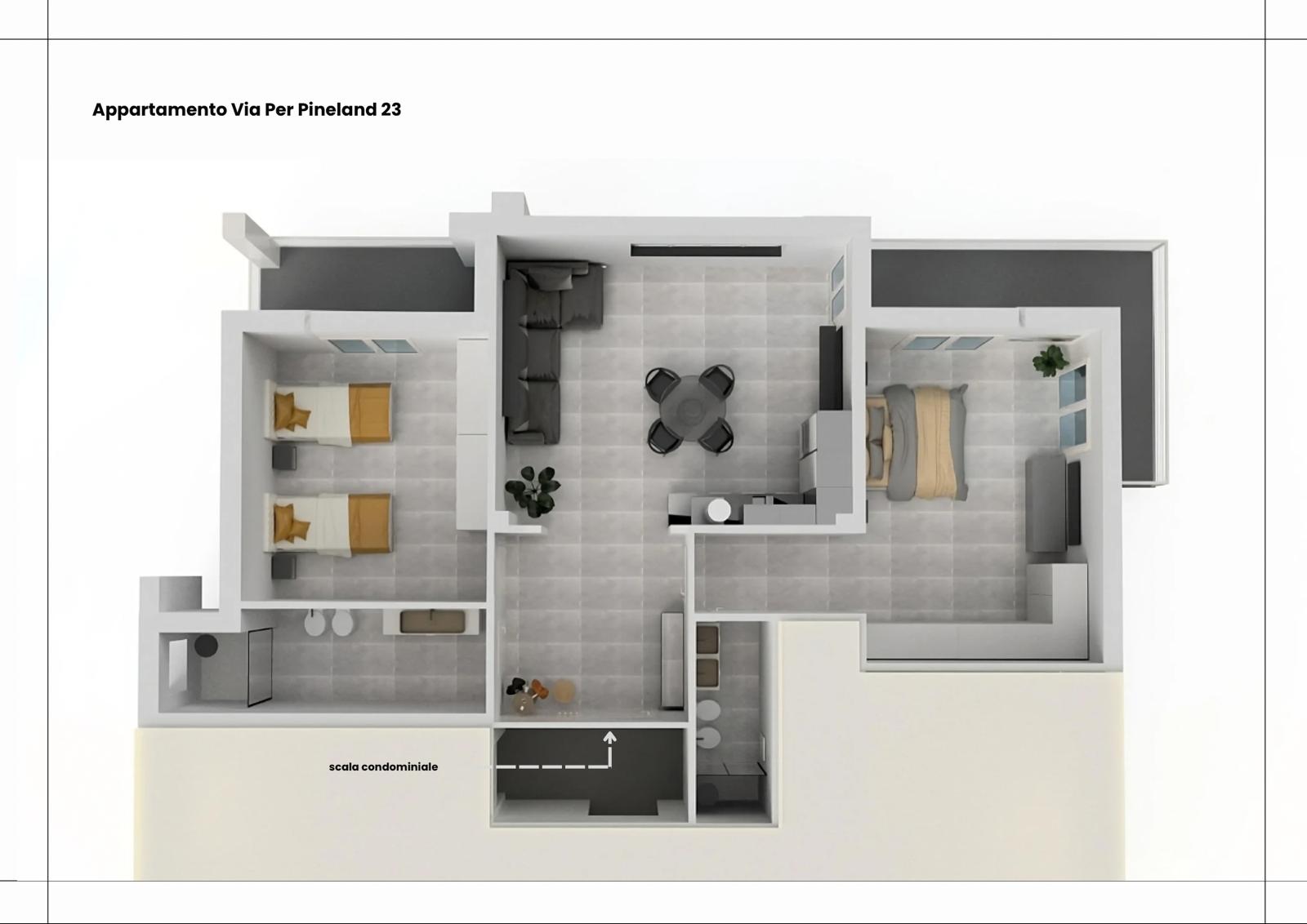 Pineland, zona ricercata e ben servita da attività e negozi, vicina al lungomare e alle spiagge. In piccola palazzina si propongono due nuovissimi trilocali in fase di realizzazione, vista mare e con posto auto. Secondo piano, molto luminoso e soleggiato, dalle spese di gestione bassissime. I due trilocali di circa 75 mq offrono la possibilità di avere un ampio soggiorno living con cucina a vista, due camere da letto, doppi servizi completi di cui il principale con finestra, due comodi balconi vista mare e posto auto. Possibilità di box auto e cantina. Ogni alloggio è personalizzabile nelle finiture e nella scelta dei dettagli.
