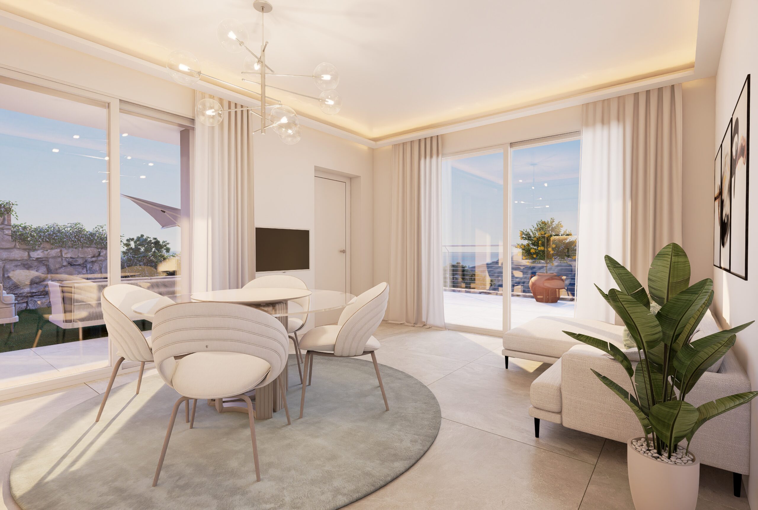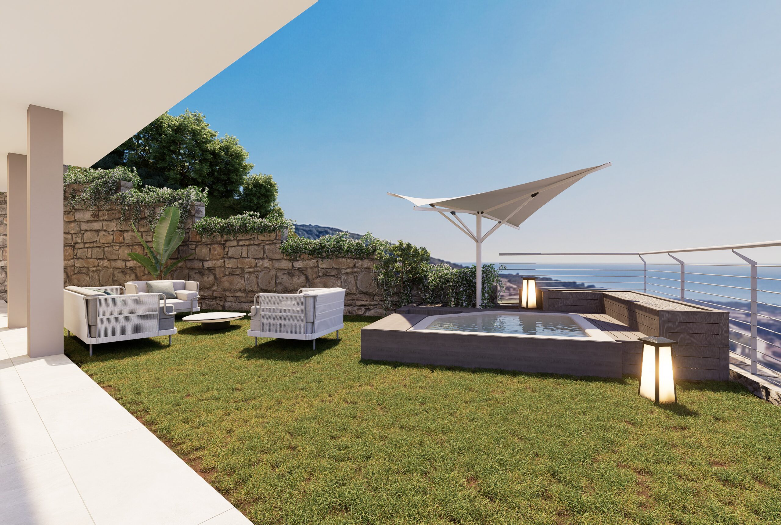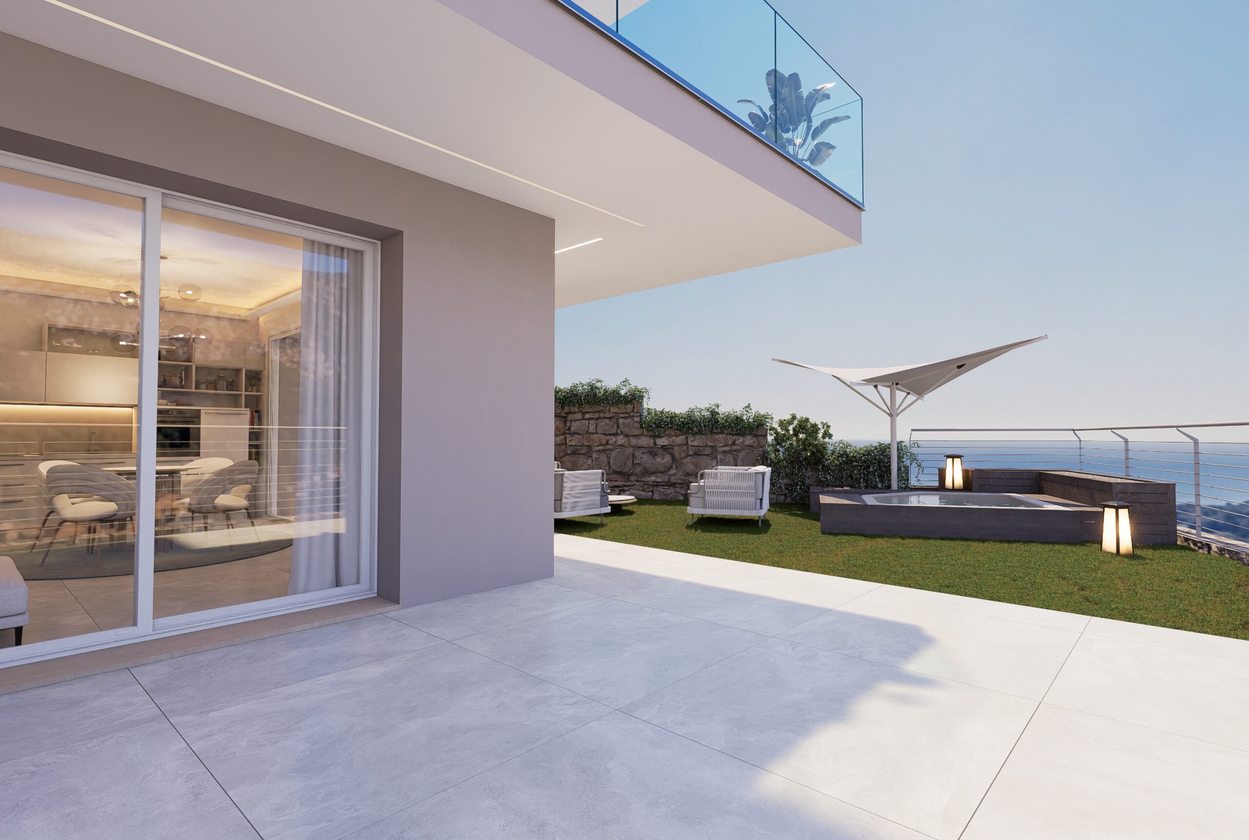 L’appartamento ‘1B’ è un alloggio di circa 75 mq con un giardino privato di oltre 105 mq dove si ha una favola vista mare frontale.