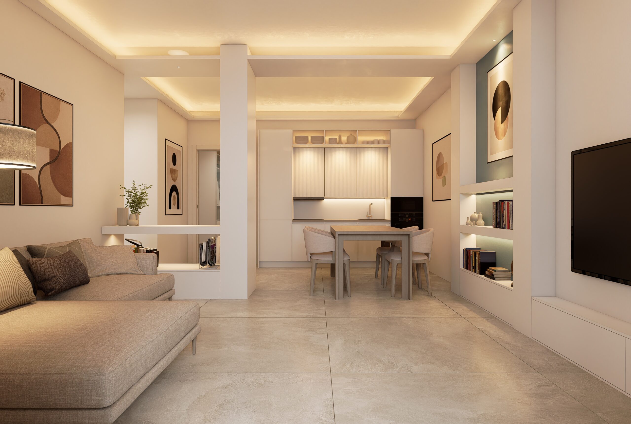 Internamente composto da ingresso su disimpegno, ampio soggiorno con cucina a vista, due camere da letto, di cui una con un utilissima cabina armadio e doppi servizi completi.